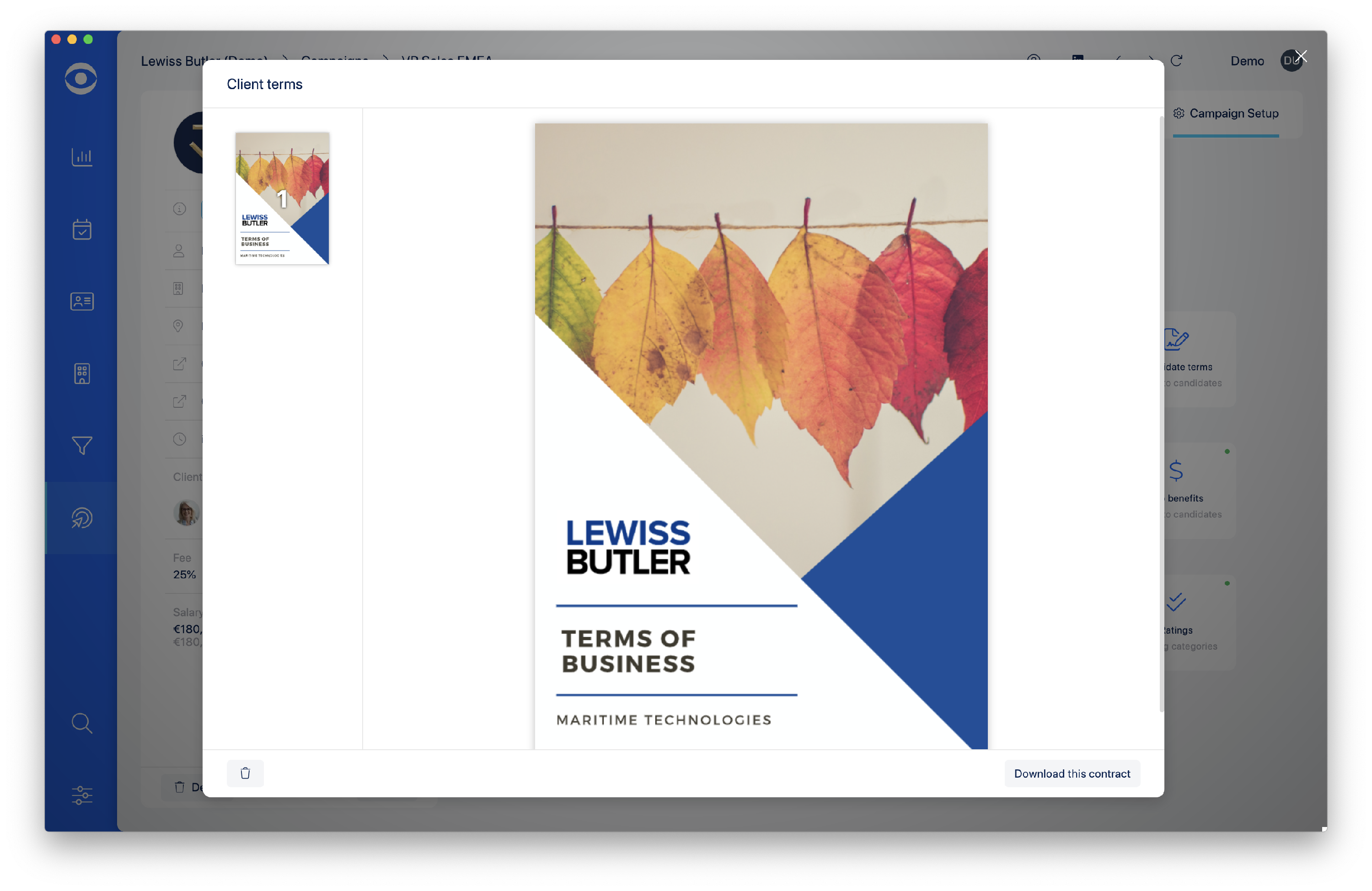 Files can be dragged and dropped into the Client terms popup window. Or, click on "Click here to upload a contract"