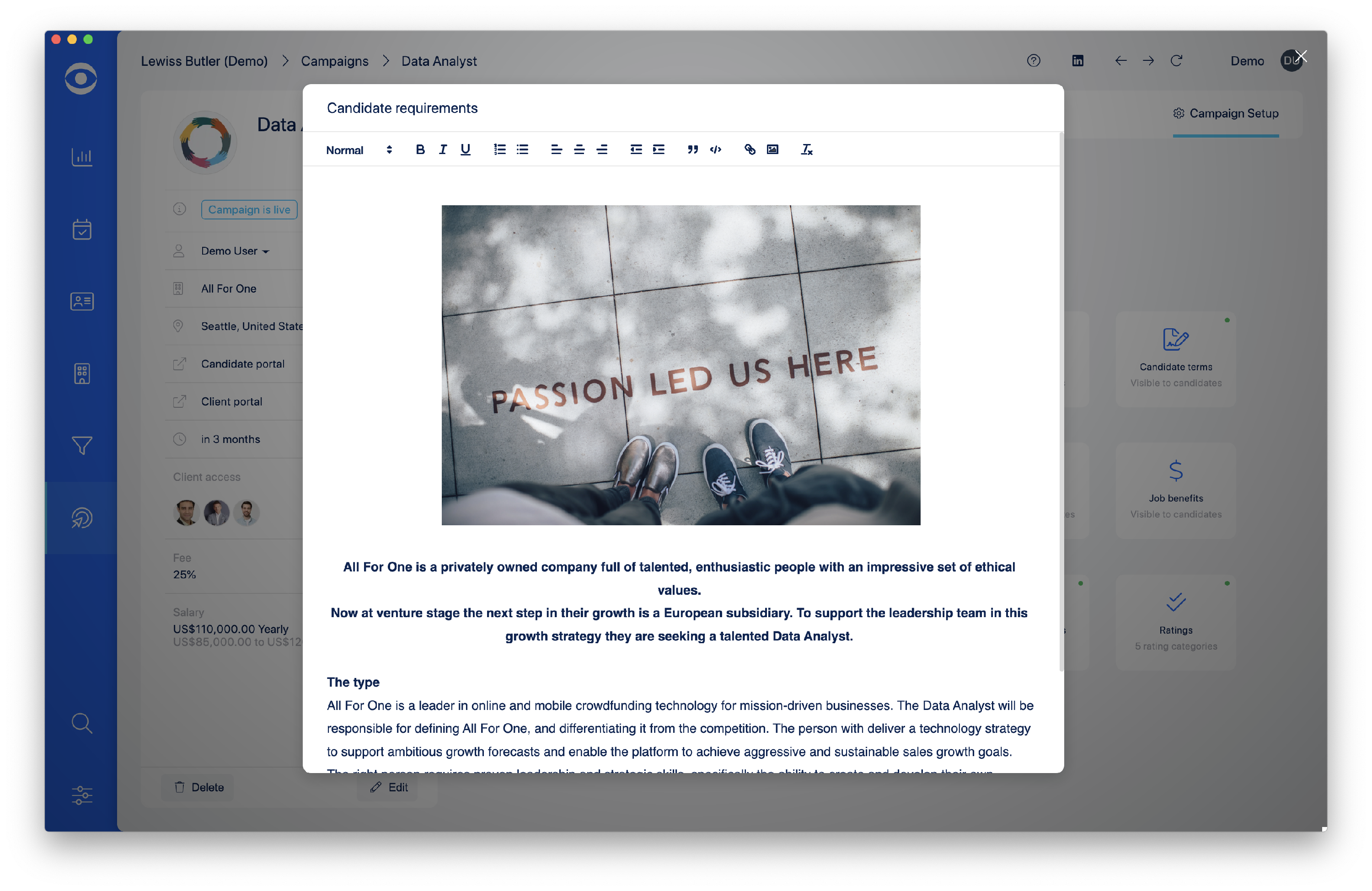 Tip: Use the text editing toolbar in the Candidate requirements popup window to ensure your content is formatted correctly and contains interesting features.